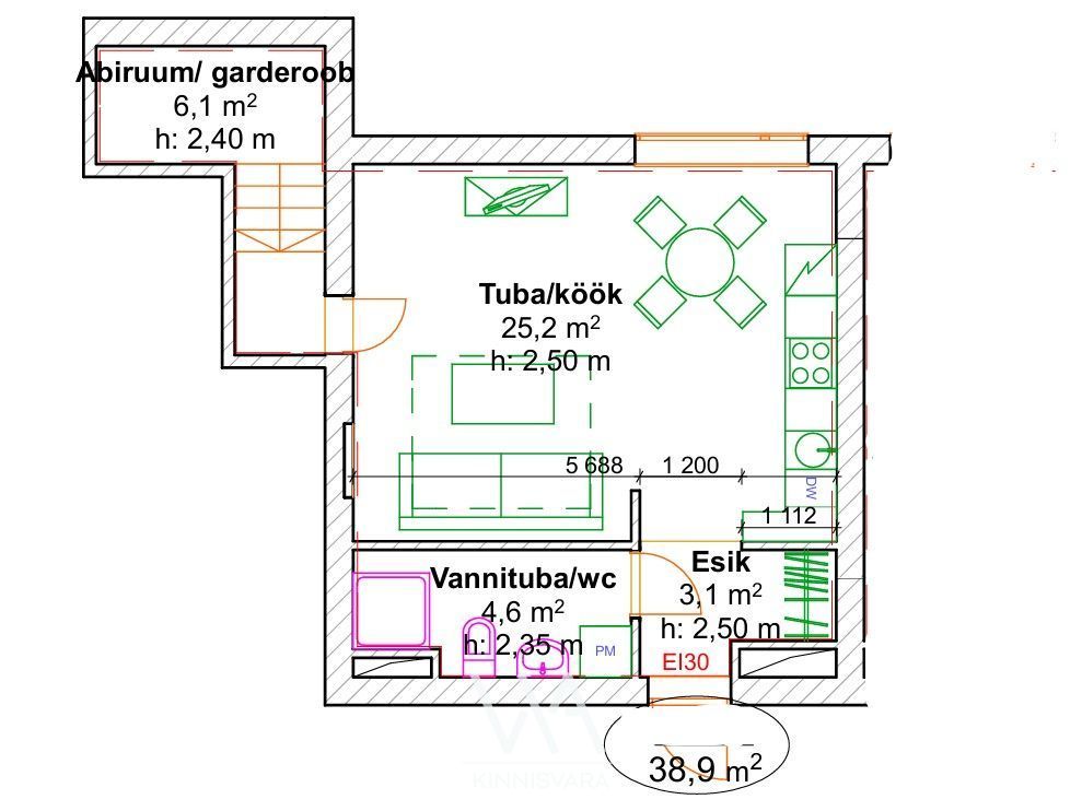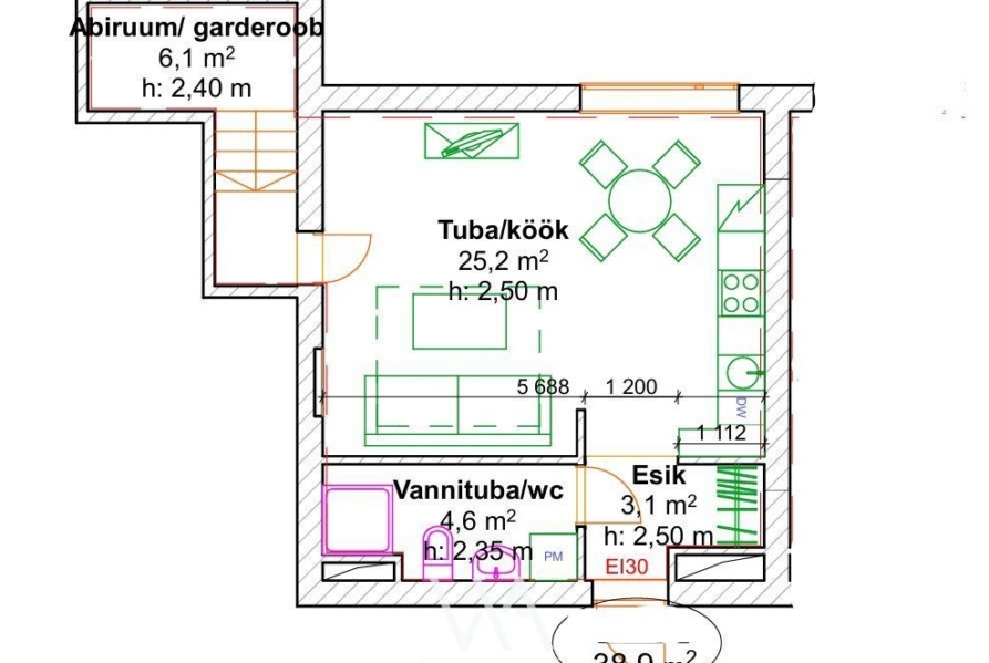 Köögis on olemas kogu igapäevaseks kasutamiseks vajalik tehnika. Esikus paikneb praktiline sisseehitatud kapp.